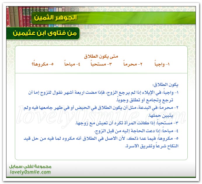 متى يكون الطلاق واجبا على الزوجين وهل ي حكم على الطلاق بالوجوب أو الحرمة للإجابة على سؤال متى يكون الطلاق واجبا علينا أول ا أن نقر بأنه أي الطلاق شأنه شأن باقي أعمال المسلم يأخذ حكم ا تكليفي ا من الأحكام الخمسة. متى يكون الزواج أو الطلاق واجبا محرما مكروها مباحا مستحبا القسم الإسلامى العام بواسطة 5lik fe 7alk. متى يكون الطلاق واجبا يصبح الطلاق واجبا على الزوج في حالة قيامه بمخالفة الأحكام والضوابط التي وضعتها الشريعة الإسلامية فإنه يطلق الزوج زوجته لأنه ليس قادرا على النفقة عليها إلا من المال. الطلاق الرجعة الإيلاء الظهار اللعان العدد الرضاع.
