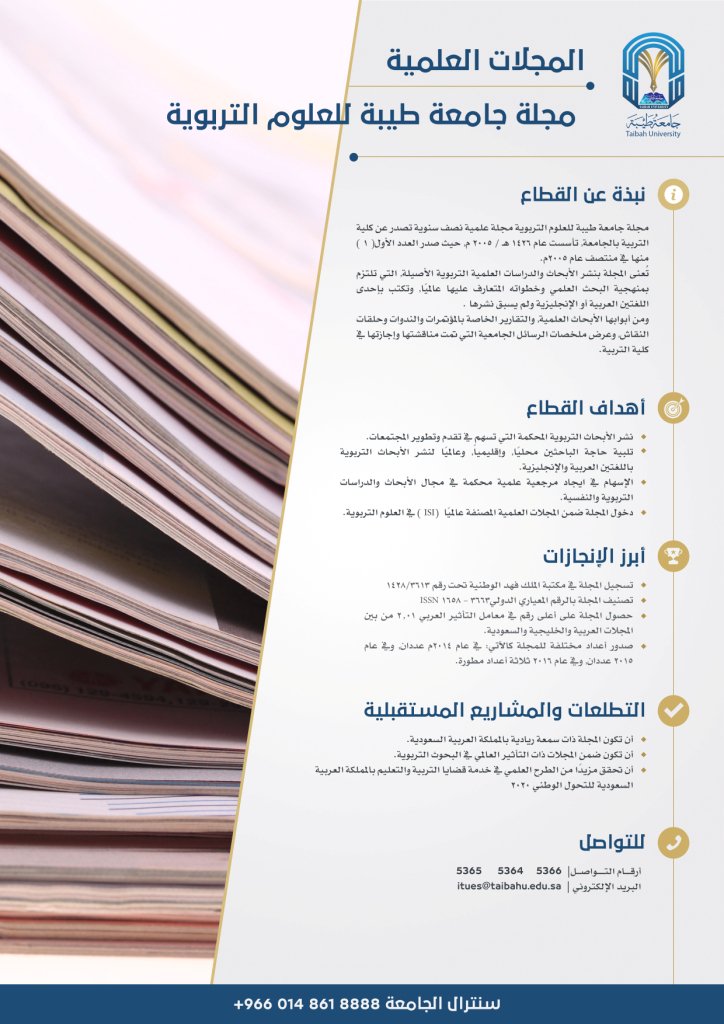 مجلة جامعة طيبة للعلوم التربوية مجلة علمية نصف سنوية تصدر عن كلية التربية بجامعة ط يبة تأسست عام 1426 2005 م حيث صدر العدد الأول 1 منها في منتصف عام 2005 م. مجلة جامعة الطيبة للعلوم التربوية لا تتحمل شبكة المعلومات العربية التربوية شمعة أي مسؤولية أو تبعات قانونية ناتجة عن محتوى المواد التي تتضمنها قاعدة. المملكة العربية السعودية الوضع الحالى للدورية. دور التوعوي للمرشد التربوي في الحد من أضرار الابتزاز الإلكتروني في مدارس محافظة رام الله والبيرة حمايل حسين جلد الله المجلة الأكاديمية العالمية في العلوم التربوية والنفسية مج.
