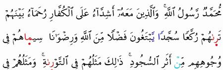 م ح م د ر س ول الل ه و ال ذ ين م ع ه أ ش د اء ع ل ى ال ك ف ار ر ح م اء ب ي ن ه م ت ر اه م ر ك ع ا س ج د ا ي ب ت غ ون ف ض ل ا م ن الل ه و ر ض و ان ا س يم اه م ف ي و ج وه ه م م ن أ ث ر الس ج ود ذ ل ك م ث ل ه م ف ي