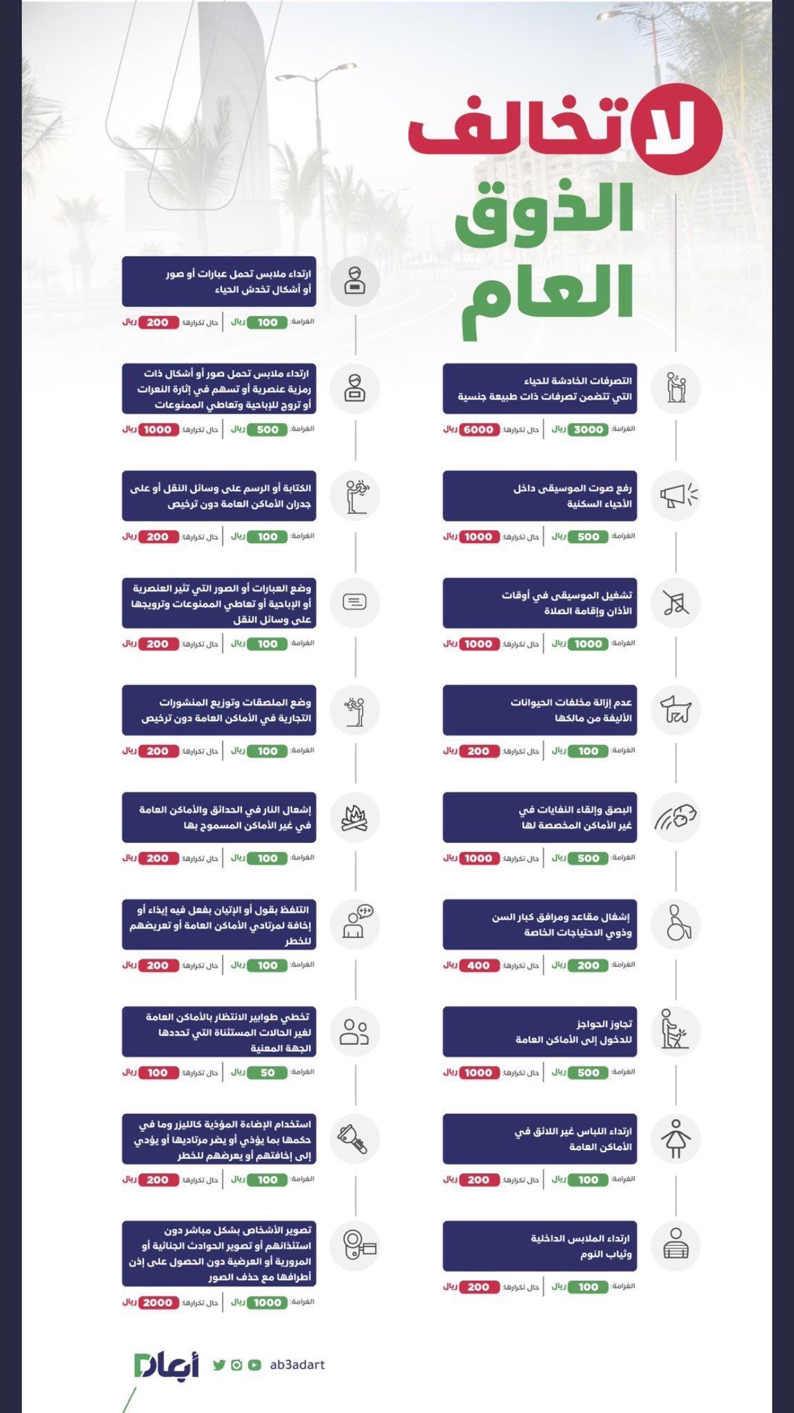 عبدالله البندر On Twitter وزارة الداخلية السعودية ابتداء من اليوم تطبق لائحة الذوق العام وتشمل 19 مخالفة يعاقب مرتكبها بغرامات مالية تعرف على مخالفات المحافظة على الذوق العام Https T Co Meojhutifx