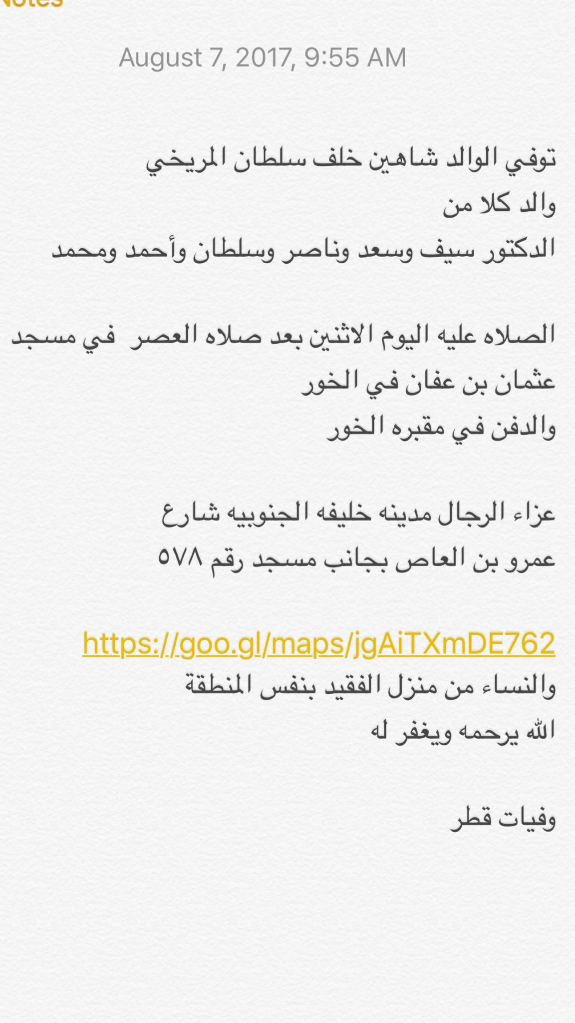 وفيات قطر على تويتر توفي الوالد شاهين خلف سلطان المريخي الصلاه عليه اليوم بعد صلاه العصر في مسجد عثمان بن عفان ف الخور الدفن في مقبره الخور الله يرحمه ويغفر له Https T Co Za3bq5z6a9