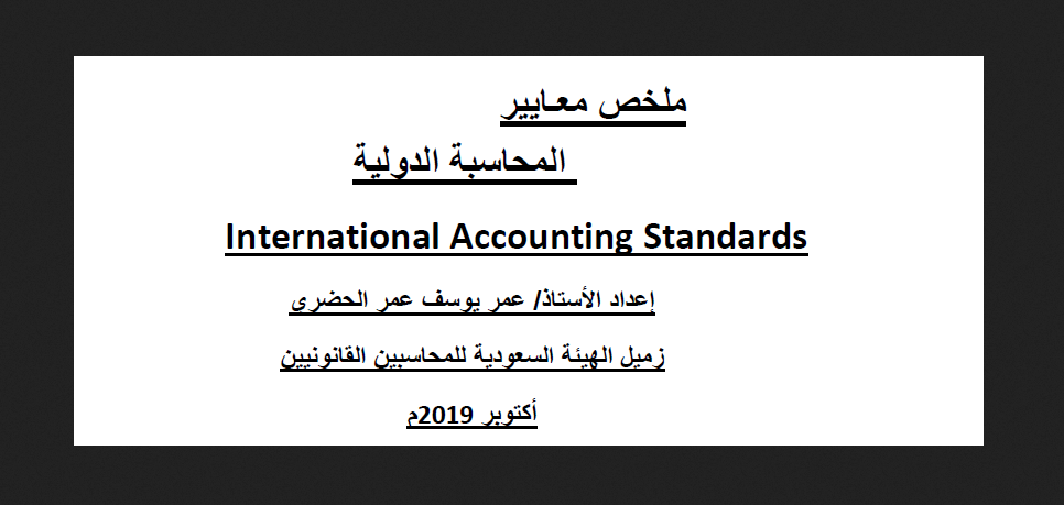 معايير المحاسبة الدولية pdf ifrs تحميل معايير المحاسبة الدولية بالعربى pdf تحميل معايير المحاسبة الدولية والانجليزى pdf financial. المعايير الدولية لإعداد التقارير المالية international financial reporting standards ifrs هي عبارة عن مجموعة من المعايير المحاسبية وتفسيراتها صادرة عن مجلس معايير المحاسبة الدولية ويجب ان تتسم تلك التقارير بالخصائص التالية ١. تعتبر معايير المحاسبة المصرية او المعايير المحاسبية بشكل عام هي الحاكم الاساسي في كيفية ادارة نشاط المحاسبة وهي التي ترتب عملية تسجيل وتبويب وتصنيف العمليات المحاسبية وكذلك. المعايير المحاسبية الدولية وتفسيراتها ifrs 2018 ias بحسب ترجمة الھيئة السعودية للمحاسبين القانونيين socpa كل معيار بملف مستقل pdf وملفات الشرح فيديو شرح مع حالات عملية.