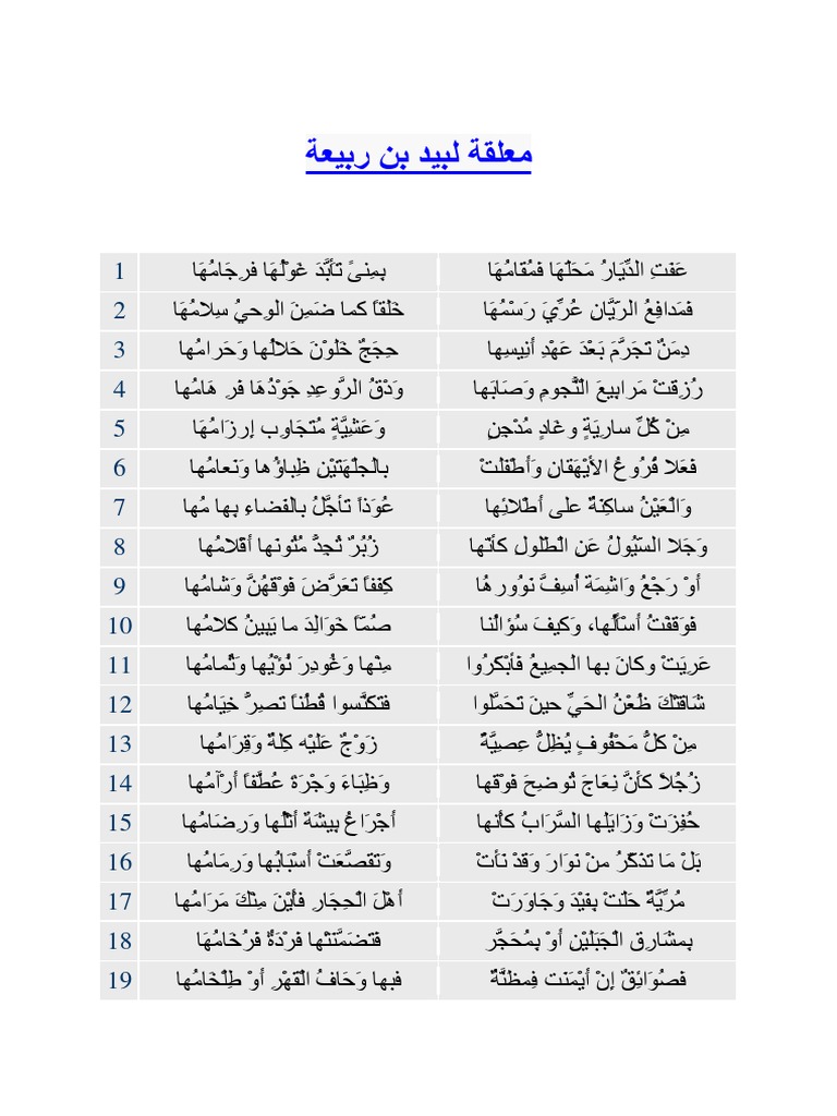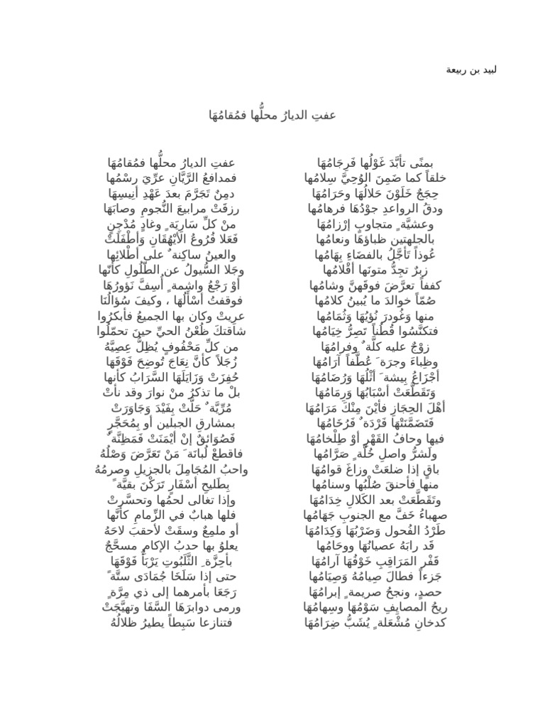 معلقة لبيد بن ربيعة. قصائد على البحر الطويل. اذهب إلى التنقل اذهب إلى البحث. ف م داف ع الر ي ان ع ر ي ر س م ه ا.